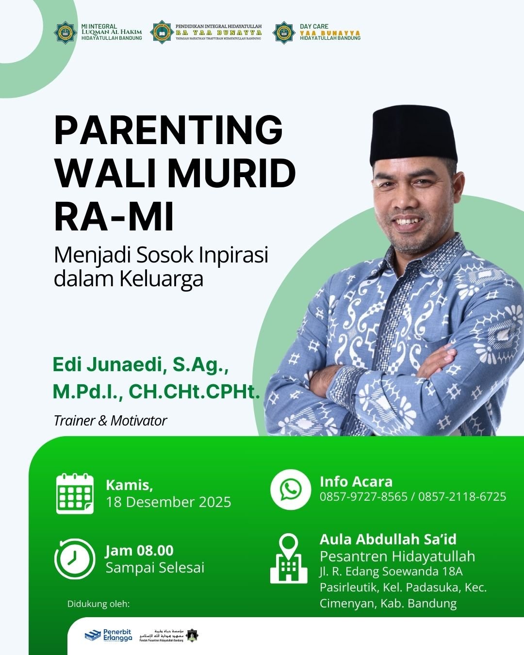 Menguundang kepada seluruh wali murid RA Yaa Bunayya dan MI Integral Luqman Al Hakim Hidayatullah Bandung, untuk mengikuti acara Parenting Wali Murid RA-MI dengan tema Menjadi Sosok Inspirasi dalam Keluarga. Acara akan dilaksanakan pada hari Kamis, tanggal 18 Desember 2025, jam 8-10 pagi. Lokasi acara ada di Aula Abdullah Sa’id, Pesantren Hidayatullah Bandung Kampus 1, Jl. R. Edang Soewanda 18A Pasirleutik, Kel. Padasuka, Kec. Cimenyan, Kab. Bandung.